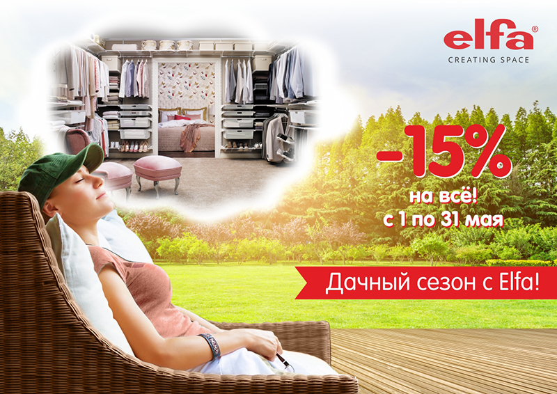 3 мая 2019 Скидка -15%! Период проведения акции: 1 мая 2019 – 31 мая 2019. Условия акции: Скидка - 15% для розничного покупателя. В акции участвует весь ассортимент продукции Elfa.